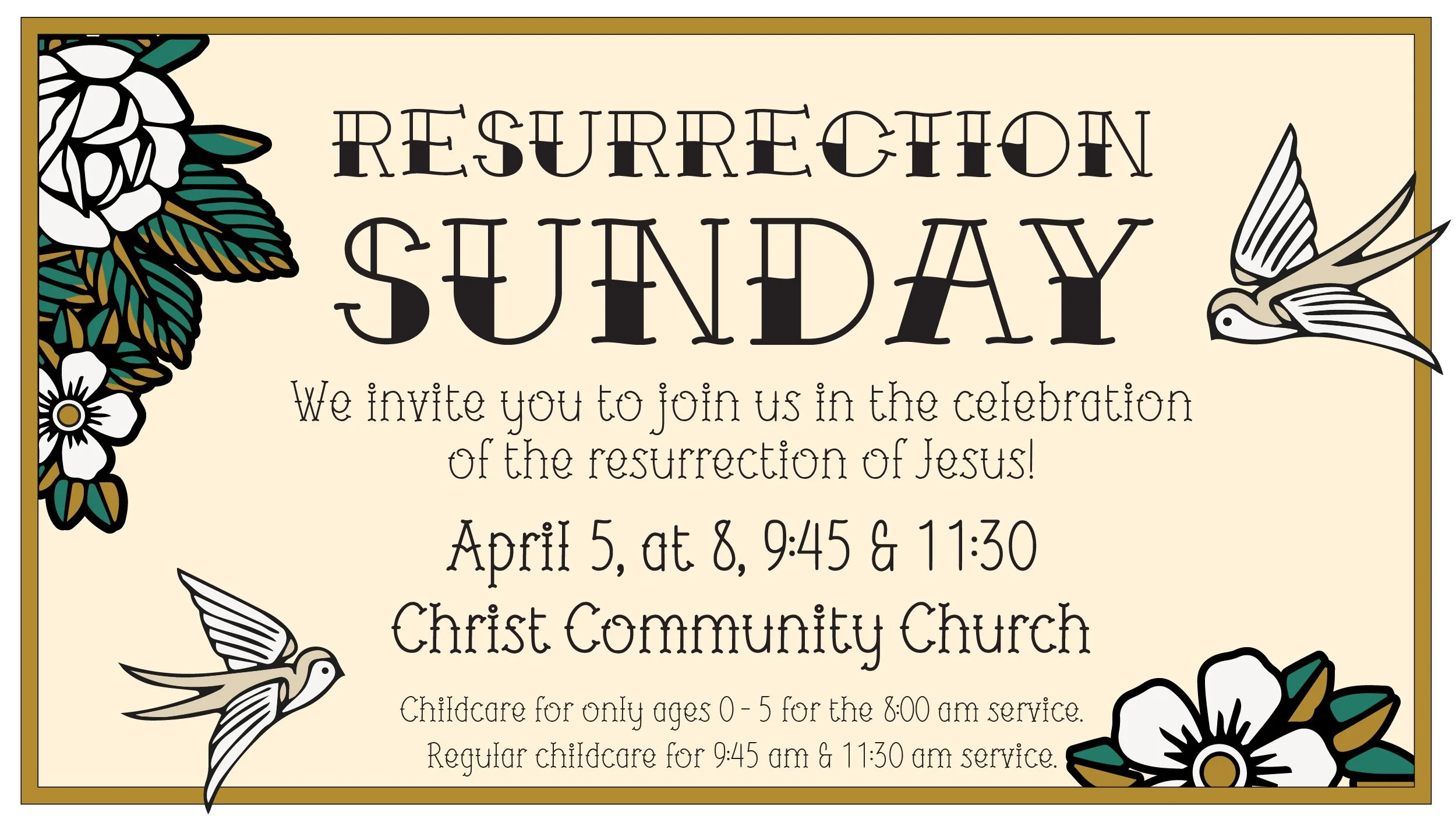 We will have three services on Easter Sunday. There will be childcare available for ages 5 and under for the 8:00 am service. Regular children’s…